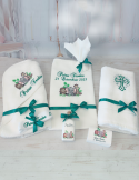 Trusoul de botez este complet echipat, fiecare piesă fiind personalizată și brodată pentru durabilitate. Setul include: