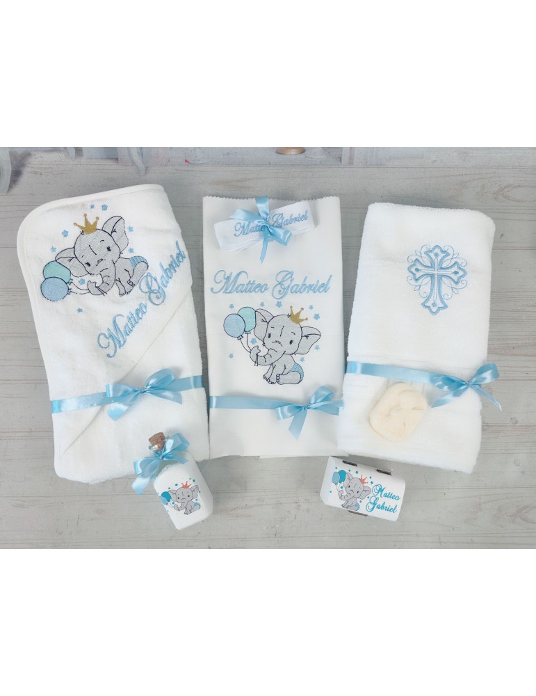Trusou brodat pentru botez cu tematica elefant bleo