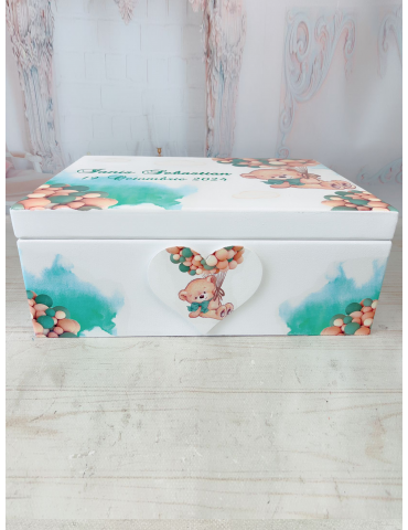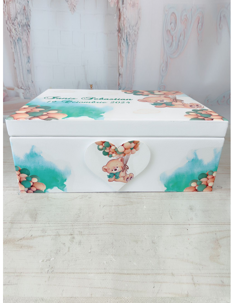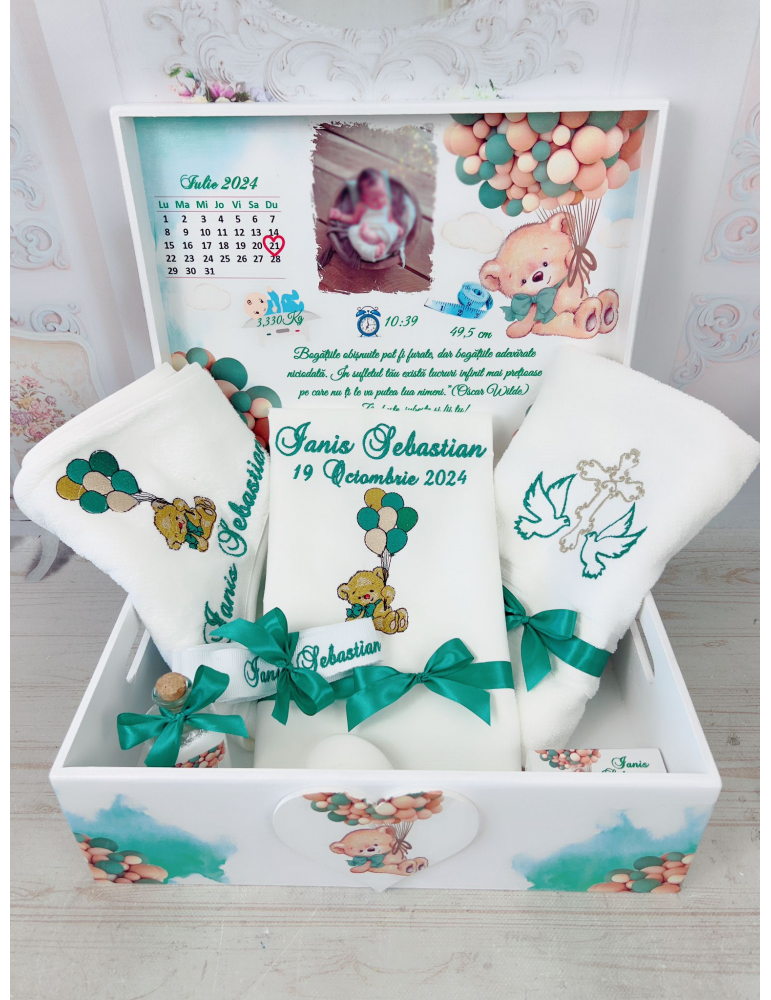 Pretul afisat se refera la setul de botez ce include: cutie amintiri, trusou brodat - personalizarea este inclusa in pret - Dimensiuni cutie de amintiri