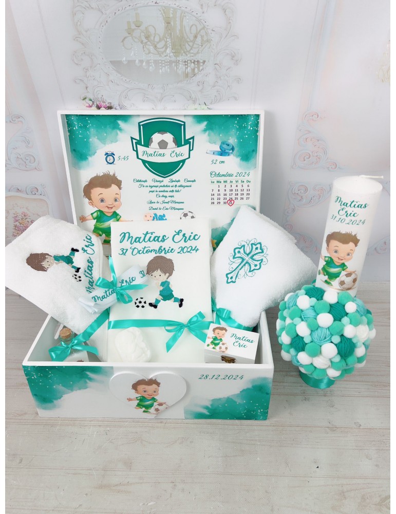 Setul poate fi personalizat cu numele copilului, data botezului sau un mesaj special, transformând fiecare piesă într-o amintire deosebită. Tematica fotbalist adaugă un element jucăuș și original, fiind ideală pentru părinții care își doresc un botez cu personalitate.