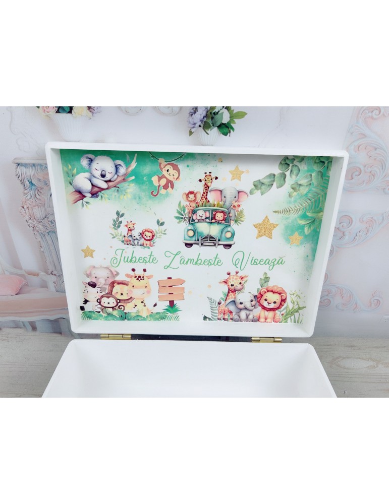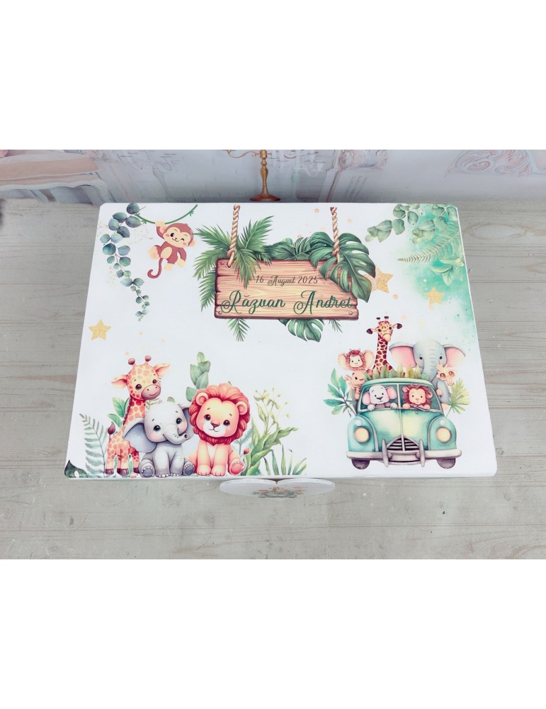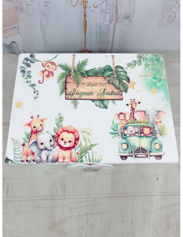 Descoperă un set de botez safari personalizat, perfect pentru un eveniment de neuitat. Fiecare element este realizat cu grijă: cutia de amintiri din lemn este decorată cu design safari și personalizată cu mesaj, poză și detalii despre nașterea copilului.