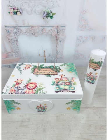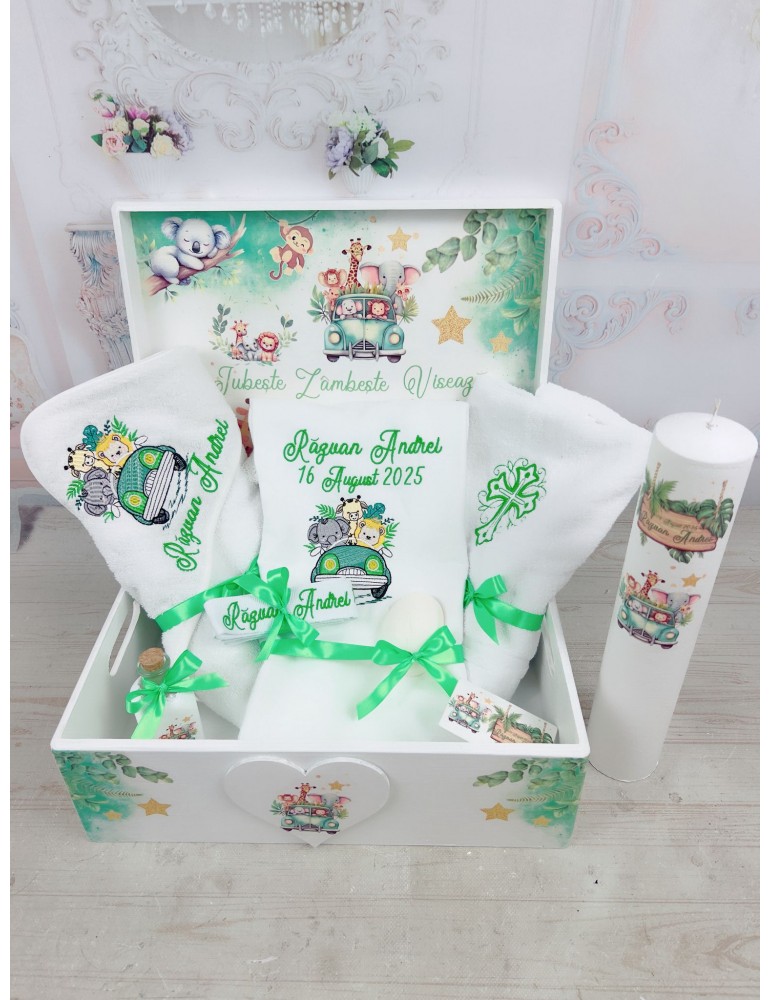 Set botez copil tematică safari – cutie amintiri, trusou brodat și lumânare personalizată