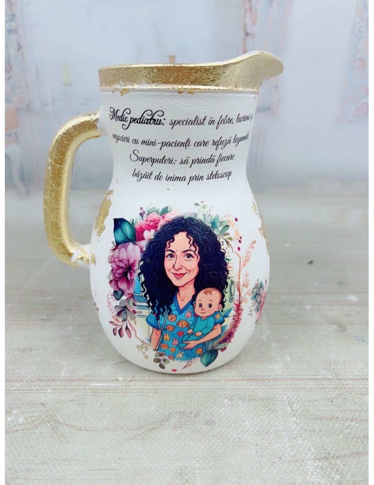 Această vază personalizată este un cadou deosebit pentru un medic sau pediatru, exprimând recunoștința și aprecierea față de dedicarea și profesionalismul lor. Decorată manual prin tehnica decoupage, vaza impresionează prin detalii elegante și materiale de calitate. Este un accesoriu perfect pentru birou sau cabinet, adăugând un plus de rafinament și personalitate spațiului. Ideală pentru Ziua Femeii, 1 Martie sau orice ocazie specială.