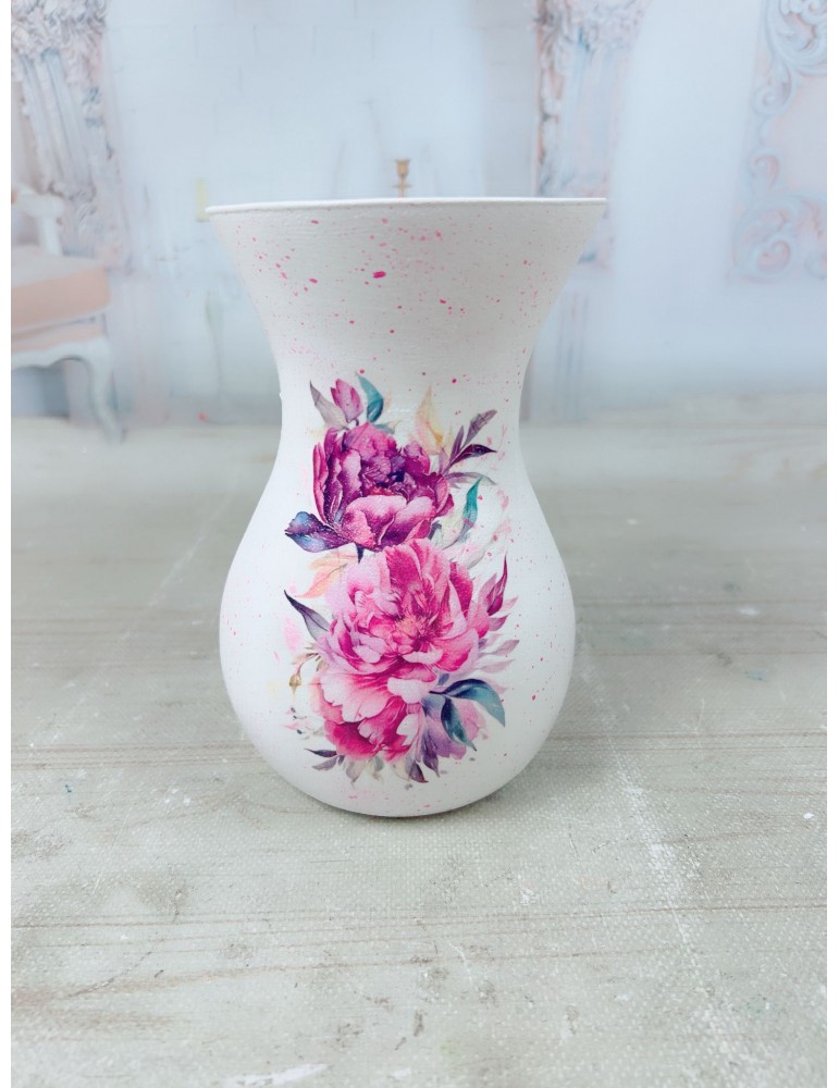 Vază personalizată handmade, realizată manual prin tehnica decoupage, cu finisaje artistice și detalii unice din foiță aurie, creată special pentru a transmite emoție și rafinament. Fiecare piesă este unicat, lucrată cu atenție la detalii, având un design delicat ce transformă orice aranjament floral într-un cadou memorabil.