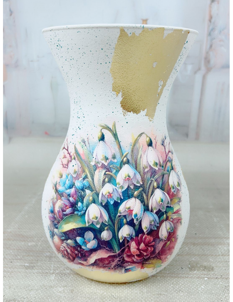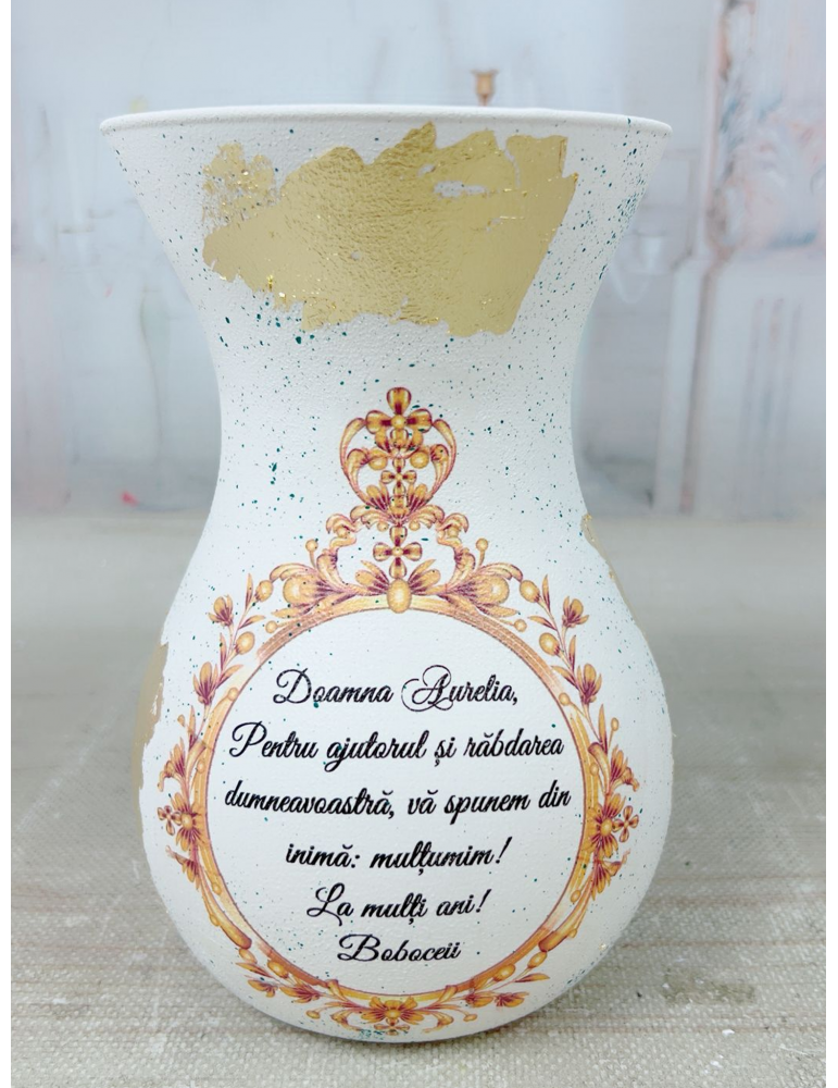 Vază personalizată handmade, realizată manual prin tehnica decoupage, cu finisaje artistice și detalii unice din foiță aurie, creată special pentru a transmite emoție și rafinament. Fiecare piesă este unicat, lucrată cu atenție la detalii, având un design delicat ce transformă orice aranjament floral într-un cadou memorabil.