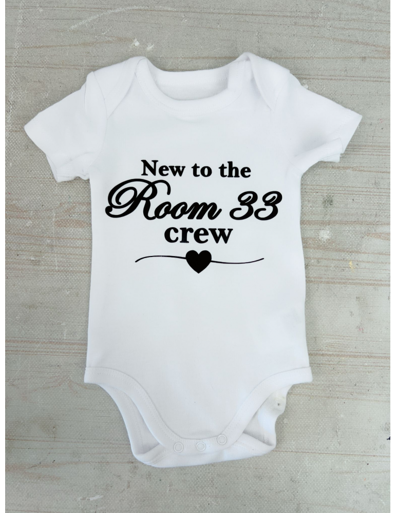 Mesajul New to Room 33 Crew face referire la faptul că mămica și prietena ei au împărțit aceeași cameră (numărul 33) în perioada studenției. Acum, bebelușul devine simbolic un nou „membru” al acelei legături speciale, ca o continuare frumoasă a prieteniei lor. Un cadou unic, cu semnificație personală, perfect pentru a marca acest moment minunat din viața noii mămici.