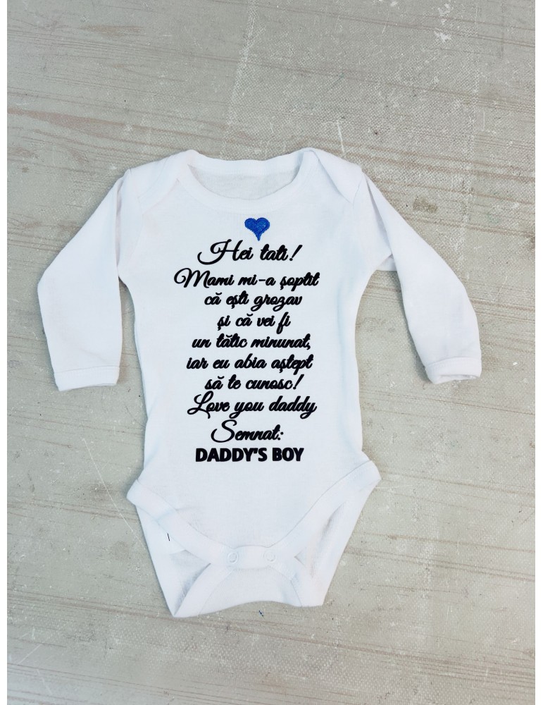 Surprinde-l pe viitorul tătic cu un body adorabil pentru gender reveal, perfect pentru a anunța că va avea un băiețel! Mesajul emoționant „Hei tati! Mami mi-a șoptit că ești grozav și că vei fi un tătic minunat...” va topi orice inimă. 👶💙