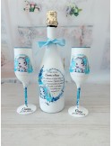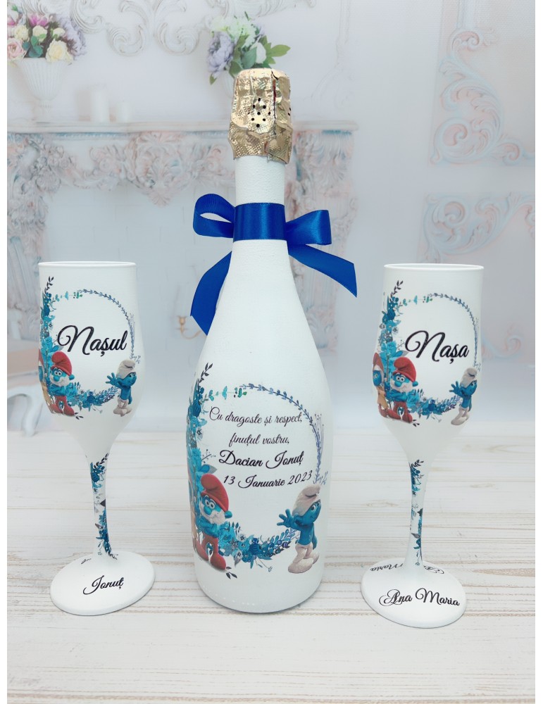Set sampanie personalizat pentru nasi cu tematica strumfi