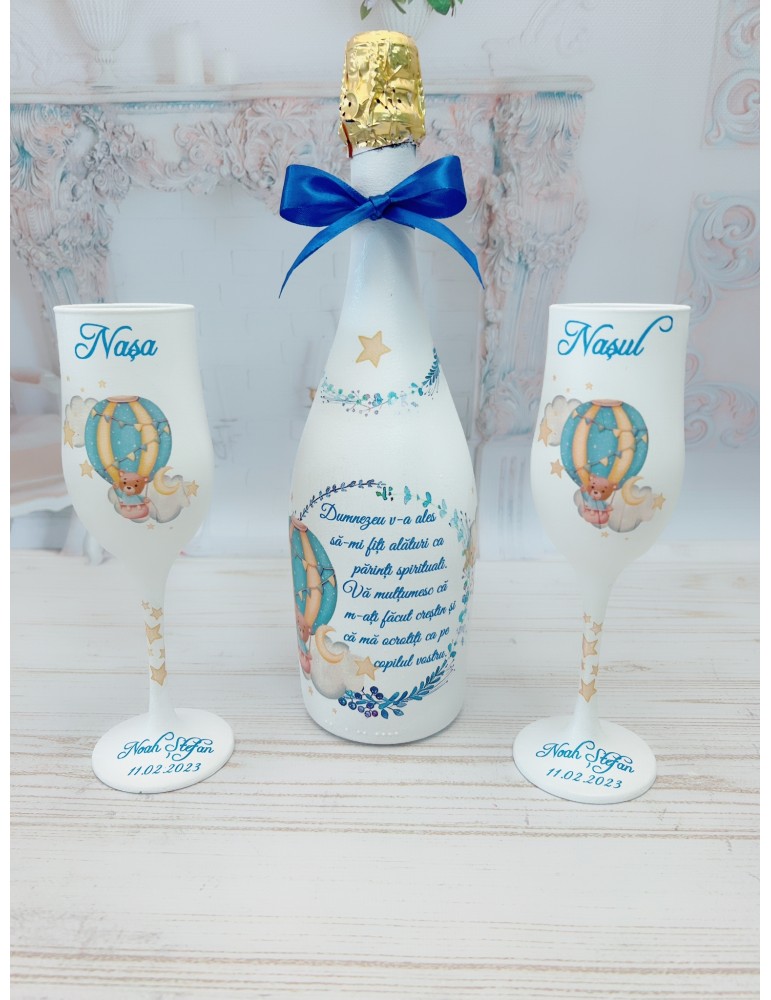• Personalizare unica: Fiecare set este decorat manual si personalizat conform dorintelor tale, fiind un cadou personalizat pentru nasi ce exprima recunostinta ta fata de ei.