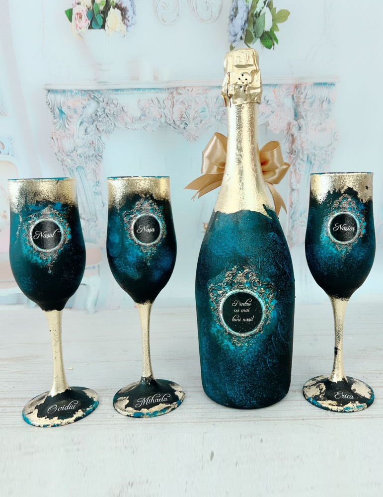 Personalizare unică – Fiecare sticlă și pahar este decorat manual și personalizat conform dorințelor tale, fiind un cadou special care transmite recunoștință și afecțiune.
