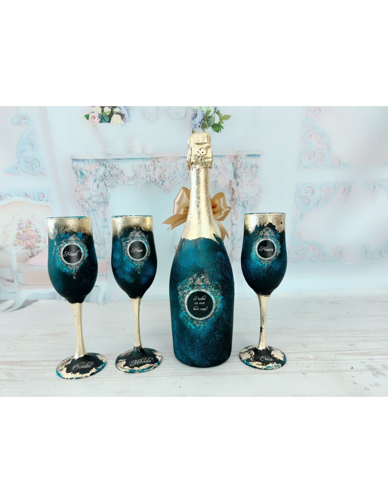 Setul conține o sticlă de șampanie Cricova personalizată și două pahare de șampanie decorate manual, toate protejate cu trei straturi de lac pentru o rezistență îndelungată. Designul este realizat prin tehnica decoupage, oferind un aspect elegant și plin de farmec. În plus, fiecare set este livrat într-un ambalaj cadou premium, gata de oferit celor dragi.