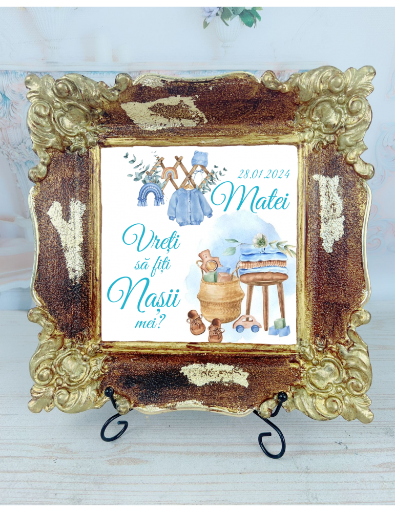 Acest tablou personalizat este darul perfect pentru un cuplu proaspat casatorit, nasi, fini sau mosi. Realizat manual din praf ceramic de calitate superioara, cu finisaje premium, acest cadou unic adauga o nota de eleganta si rafinament oricarei ocazii speciale. Tehnica decoupage, combinata cu hartie de matase, foita aurie si patina de antichizare, creeaza un efect vizual deosebit. Fiecare tablou poate fi personalizat cu texte si fotografii, transformandu-l intr-un simbol al iubirii si al legaturii speciale dintre cuplu si cei dragi. Un dar memorabil, care va infrumuseta orice camin.