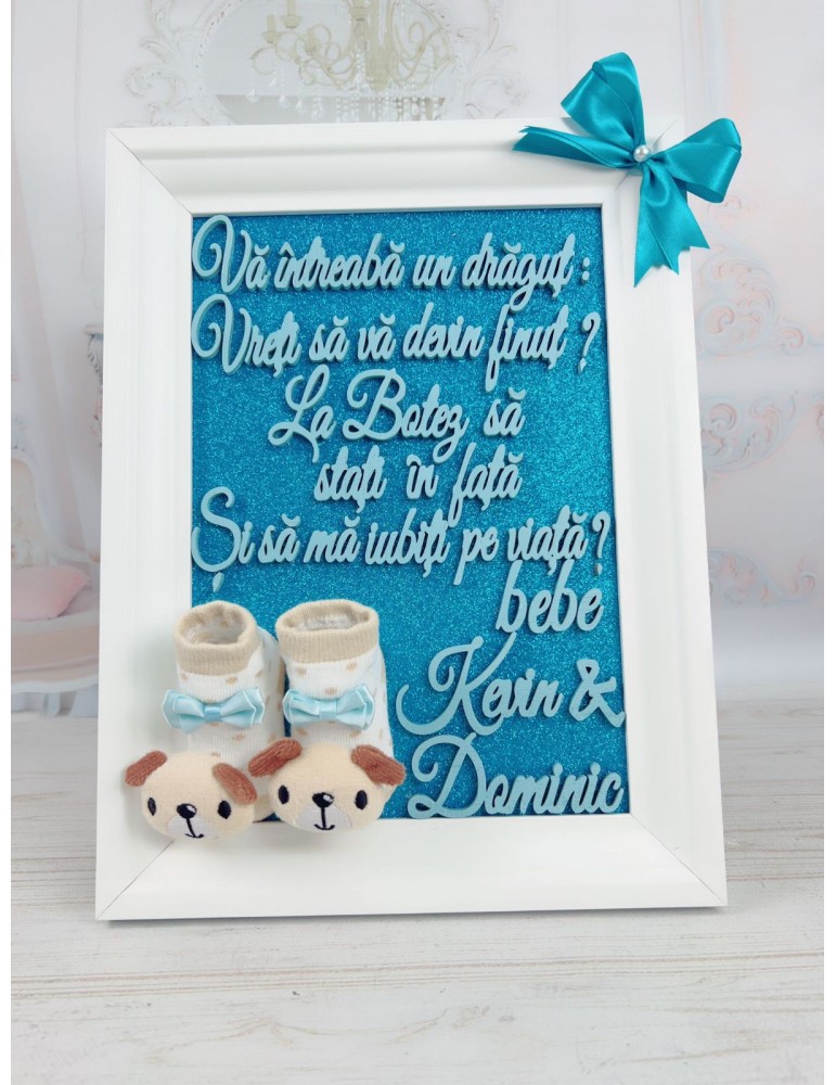 Cadou Personalizat pentru Nașii de Botez – Ramă 40x40 cm cu Mesaj și Botoșei