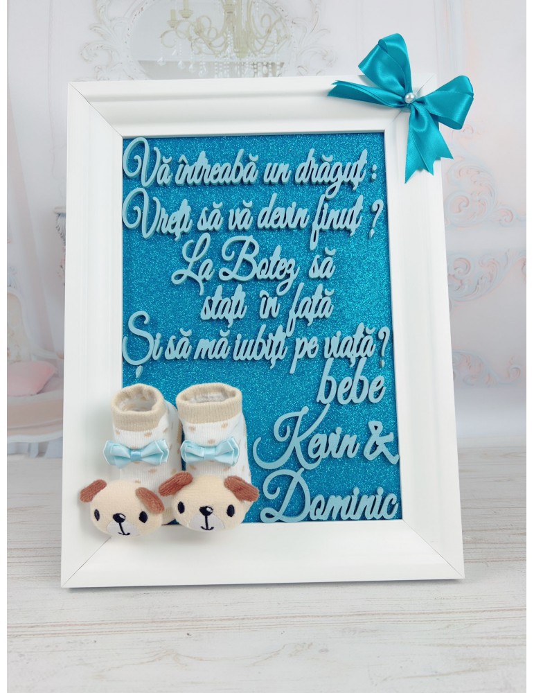 Surprinde-ți nașii de botez cu un cadou unic și emoționant! Această ramă personalizată de 40x40 cm conține un mesaj decupat prin laser și o pereche de botoșei sau șosete adorabile, simbol al legăturii speciale dintre finuț și părinții spirituali. Un dar elegant, perfect pentru a exprima recunoștința într-un mod de neuitat!