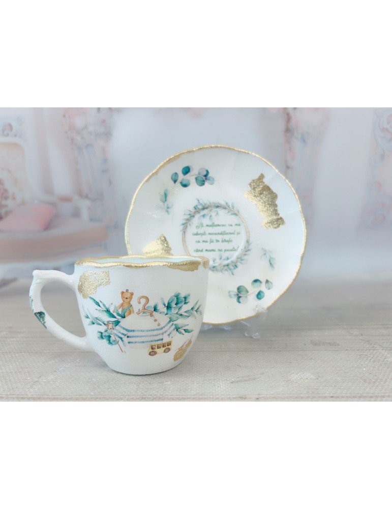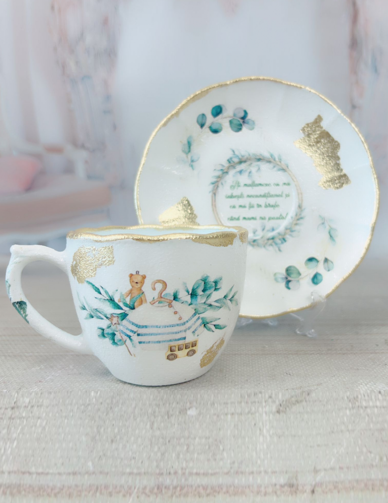 Acest set cadou personalizat este alegerea ideală pentru mămica, moșica sau nășica unui copil, fiind un cadou plin de eleganță și semnificație. Setul include o cească și o farfurioară, ambele decorate cu tehnica decoupage, creând un design unic, completat de foiță aurie și accente de verde eucalipt. Graficile delicate și stilizate fac acest cadou nu doar funcțional, ci și o piesă decorativă deosebită, ce adaugă un plus de rafinament și apreciere celor care își dedică iubirea și grija copiilor.