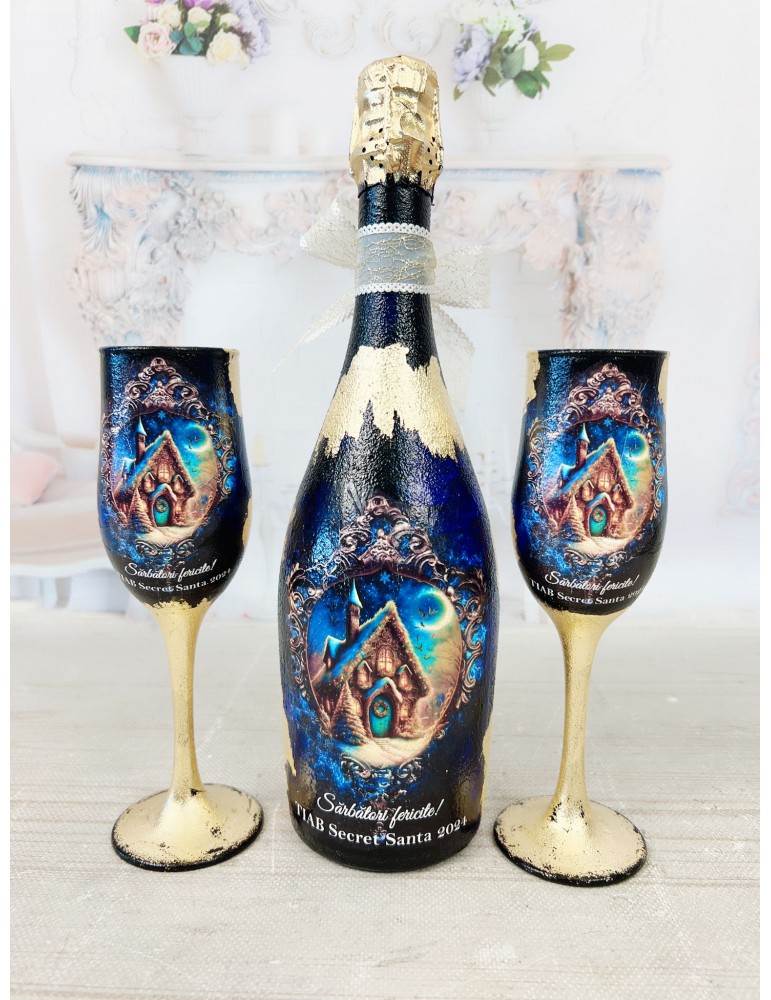 Descopera un set cadou unic, perfect pentru a celebra meseria de inginer! Acest set este compus dintr-o sticla si pahare personalizate prin tehnica decoupage, lucrate manual cu atentie la detalii. Fiecare piesa este decorata cu foita aurie, adaugand un plus de rafinament si eleganta.