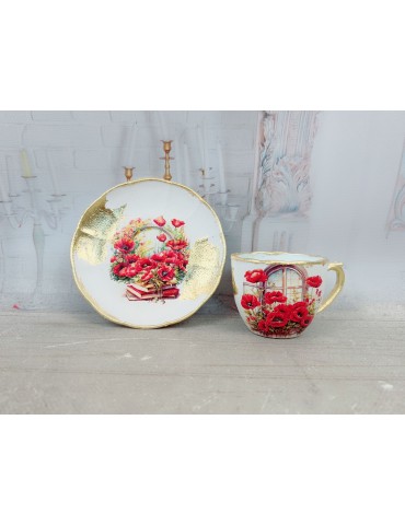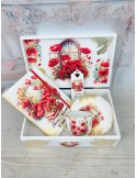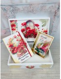 Dăruiește un cadou cu adevărat special cu acest set cadou format din: cutie din lemn,semn de carte, cească și farfurie, toate lucrate manual cu multă atenție la detalii. Fiecare piesă este decorată cu o tematică delicată de maci și foiță aurie, aducând o notă de eleganță și rafinament oricărei ocazii.