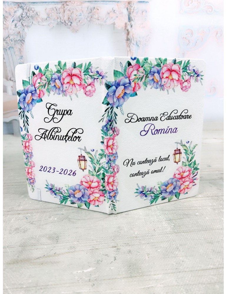 Această agenda personalizată pentru educatoare este realizată manual prin tehnica decoupage, folosind produse profesionale non-toxice, pentru a crea un design floral primăvăratic plin de culoare și energie. Ideală pentru a celebra Ziua Femeii sau ziua de naștere, acest cadou unic adaugă un strop de frumusețe și funcționalitate biroului educatoarei, fiind un obiect practic și elegant. Un cadou perfect pentru a arăta aprecierea și respectul față de persoana care îndrumă și educă.