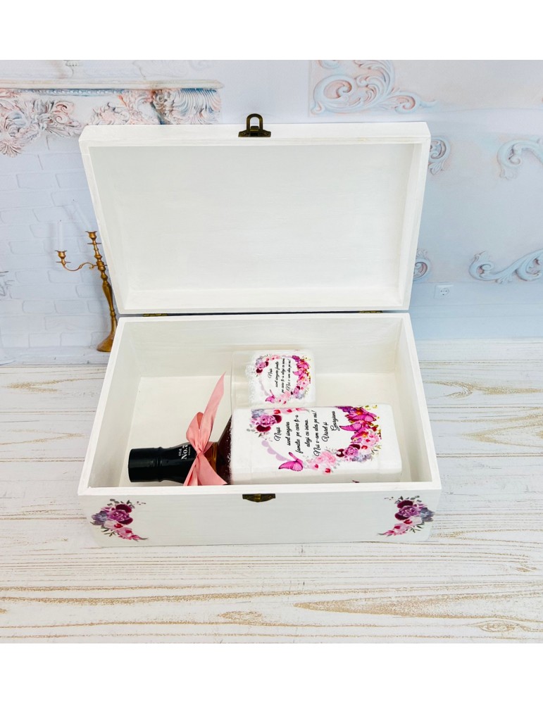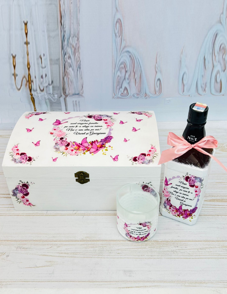 Sticla personalizata si cutie din lemn cadou pentru nasi