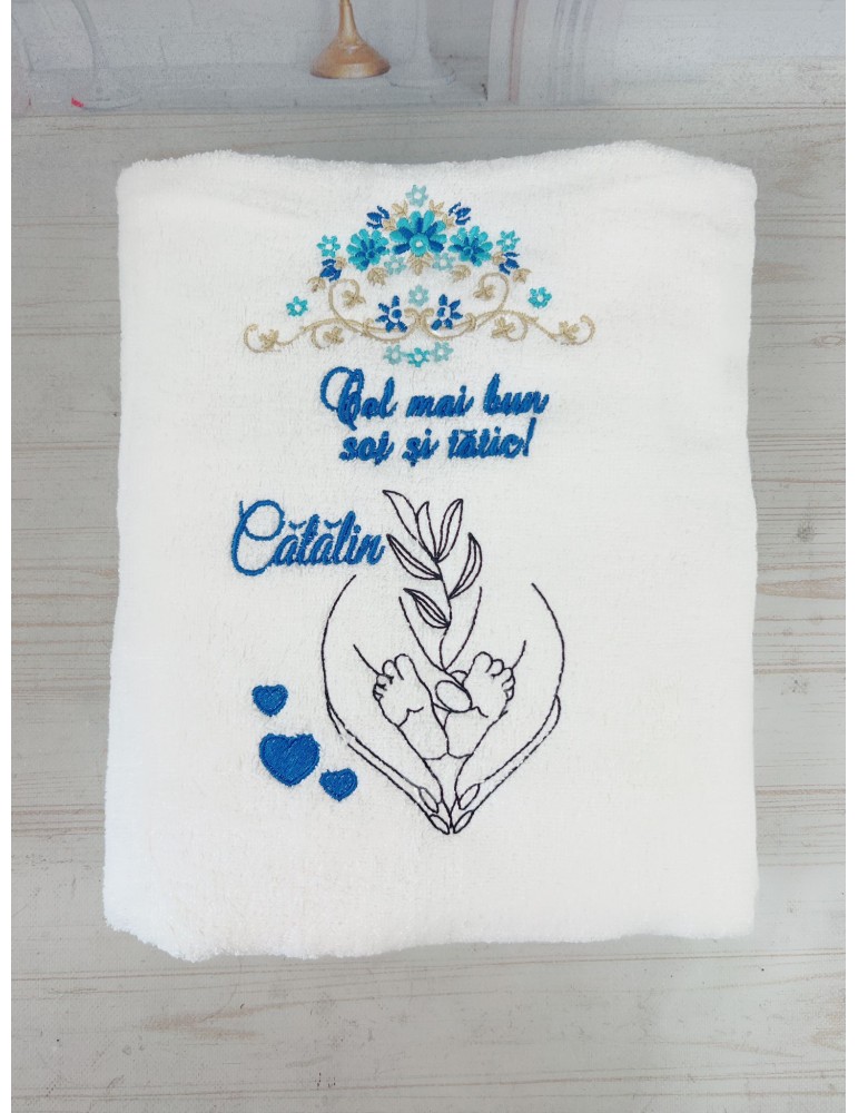 Prosop 100% bumbac, moale și calitativ, brodat cu mesajul „Cel mai bun soț și tătic”. Cadou perfect pentru Ziua Îndrăgostiților sau aniversarea căsătoriei, util și emoționant.