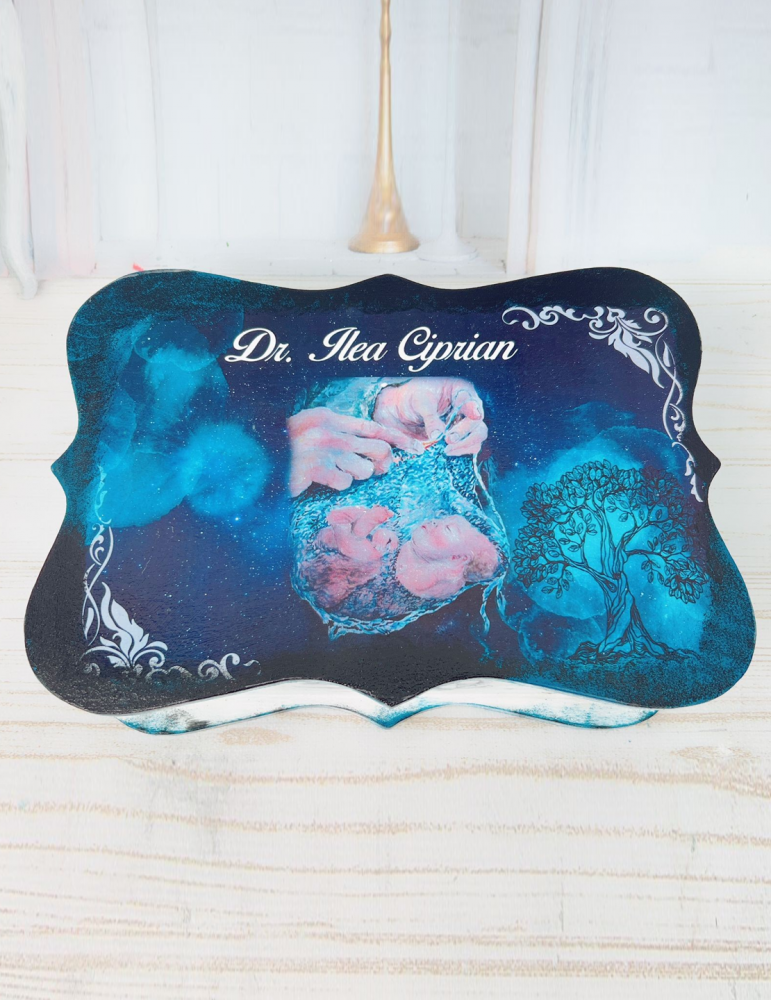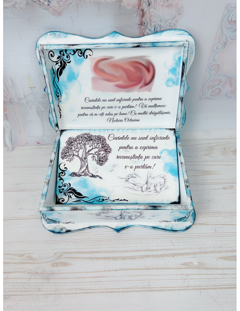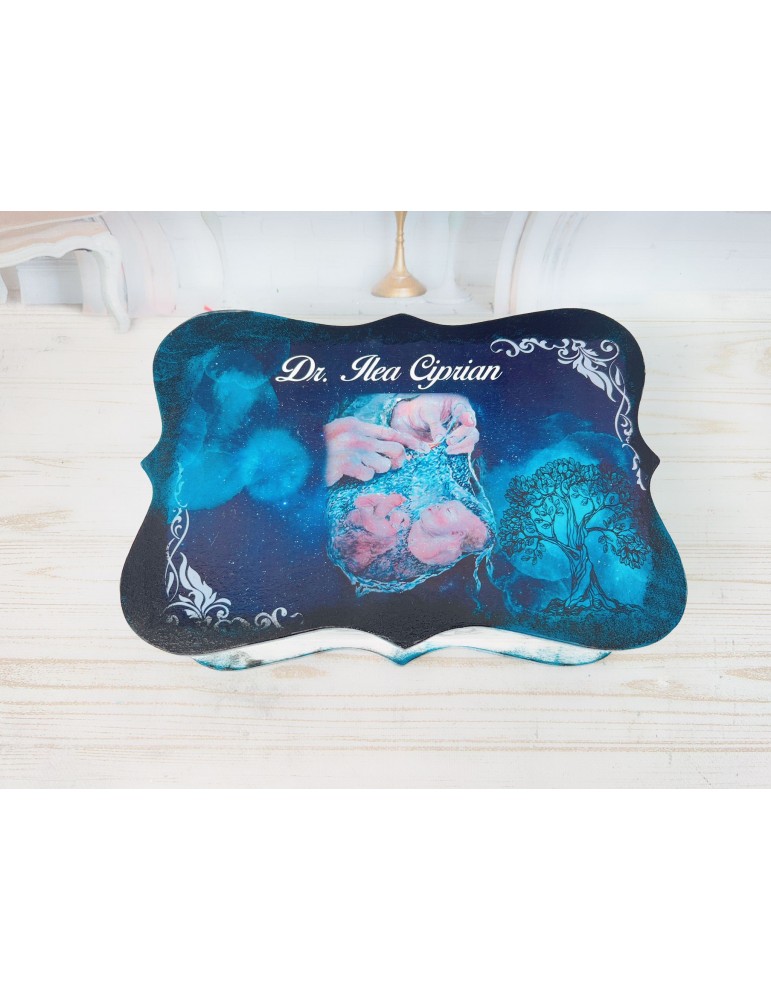 Cutia si placuta sunt vopsite si decorate manual in cadrul atelierului nostru folosind tehnica decoupage si produse NON TOXICE marca MAXI DECOR.