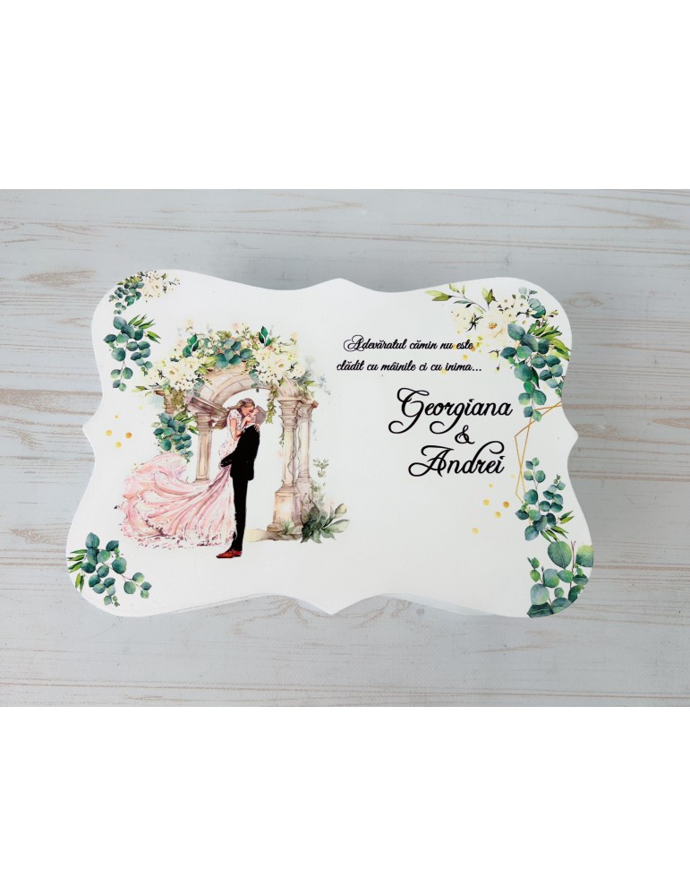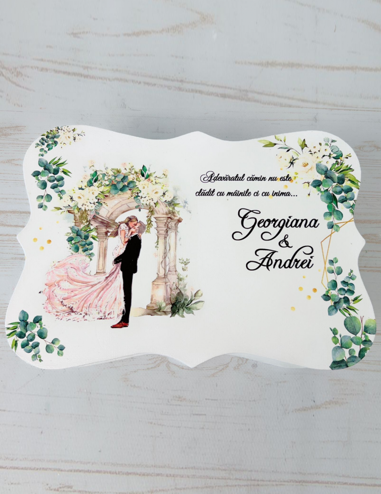 Oferă miresei un cadou deosebit cu această cutie elegantă pentru bijuterii, perfectă pentru a păstra amintirile prețioase ale zilei de nuntă. Fabricată din materiale de calitate superioară, cutia pentru bijuterii mireasă este personalizată pentru a adăuga un strop de rafinament și unicitate. Designul său sofisticat o face un cadou memorabil, ideal pentru a proteja și păstra bijuteriile sau alte accesorii speciale ale miresei. Alege această cutie personalizată pentru un gest elegant, care va rămâne un simbol al zilei celebrei și al amintirilor de neprețuit.
