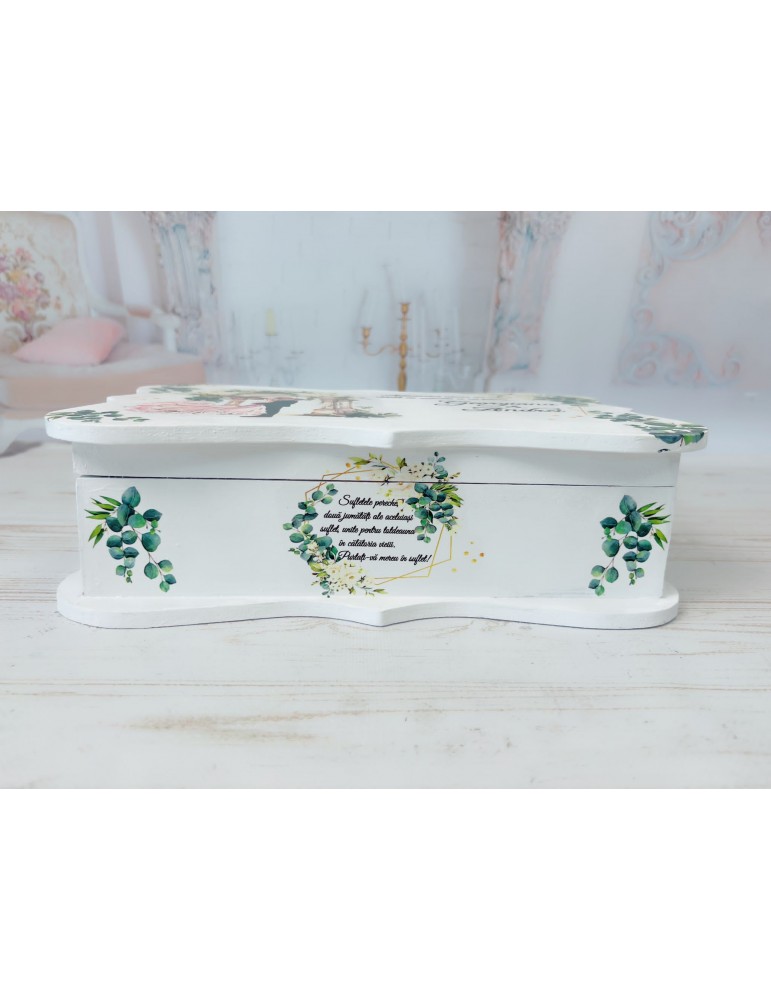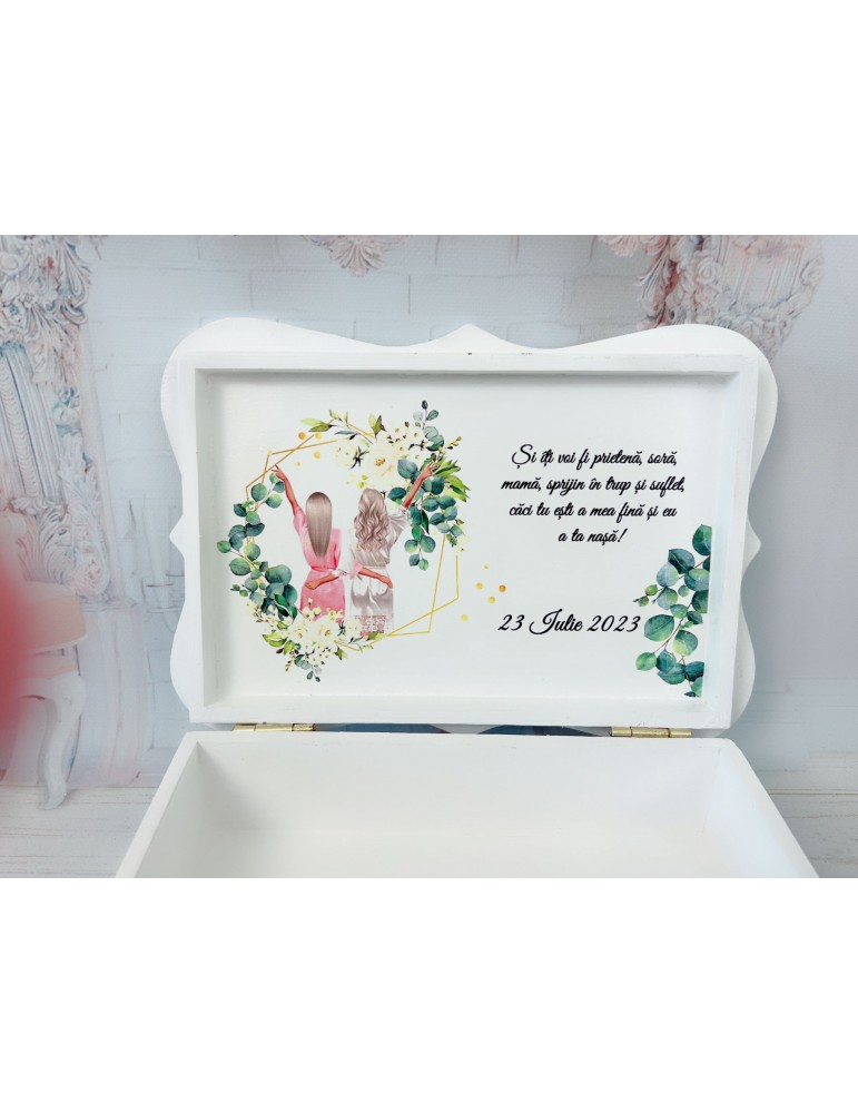 Descoperă cutia perfectă pentru bijuteriile unei mirese! Această cutie elegantă și personalizată este ideală pentru a păstra amintirile și accesoriile prețioase ale zilei de nuntă. Realizată din materiale de calitate, cutia pentru bijuterii mireasă adaugă un plus de rafinament și sofisticare oricărei ceremonii. Personalizarea sa unică face din acest cadou un suvenir deosebit, care va rămâne o amintire prețioasă pentru mireasă. Alege această cutie personalizată pentru a oferi un dar special și memorabil, care va adăuga o notă de magie zilei celebrei!