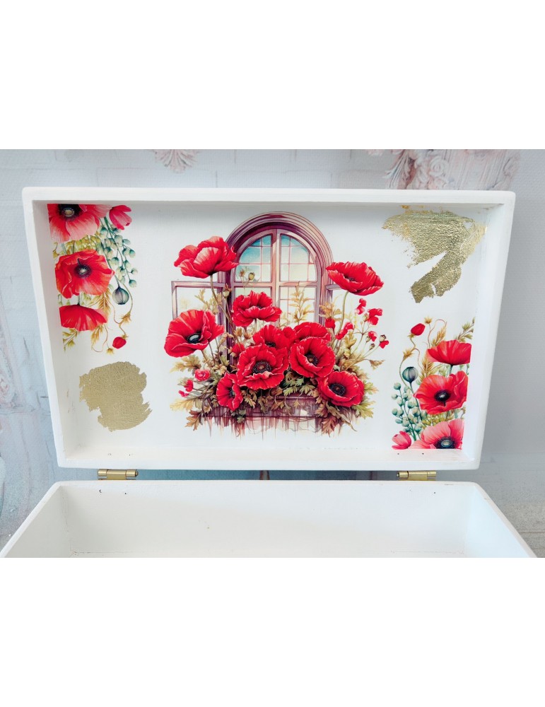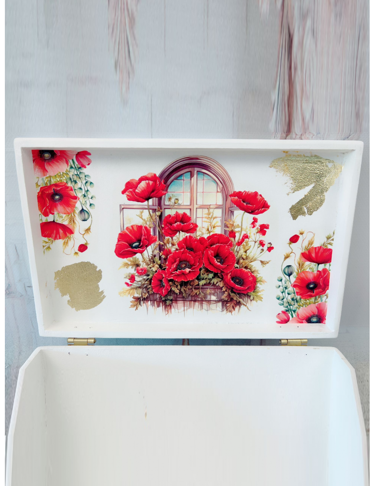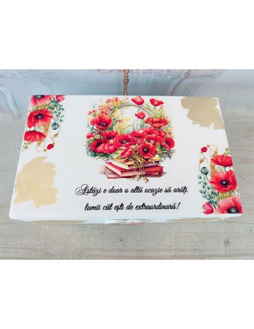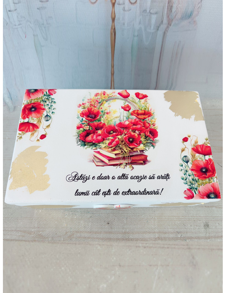 Descoperă eleganța și rafinamentul unei cutii din lemn personalizate, decorată cu motive delicate de maci și foaie aurie, perfectă pentru orice ocazie specială. Realizată din materiale premium, non-toxice și sigilată cu lac de protecție, această cutie oferă nu doar un design impresionant, ci și durabilitate de lungă durată. Fiecare detaliu este atent lucrat, asigurând o finisare de calitate superioară care rezistă în timp. Ideală pentru a păstra obiecte prețioase sau a oferi un cadou unic și personalizat, cutia combină estetica deosebită cu funcționalitatea practică, devenind astfel un element de decor deosebit pentru orice spațiu.