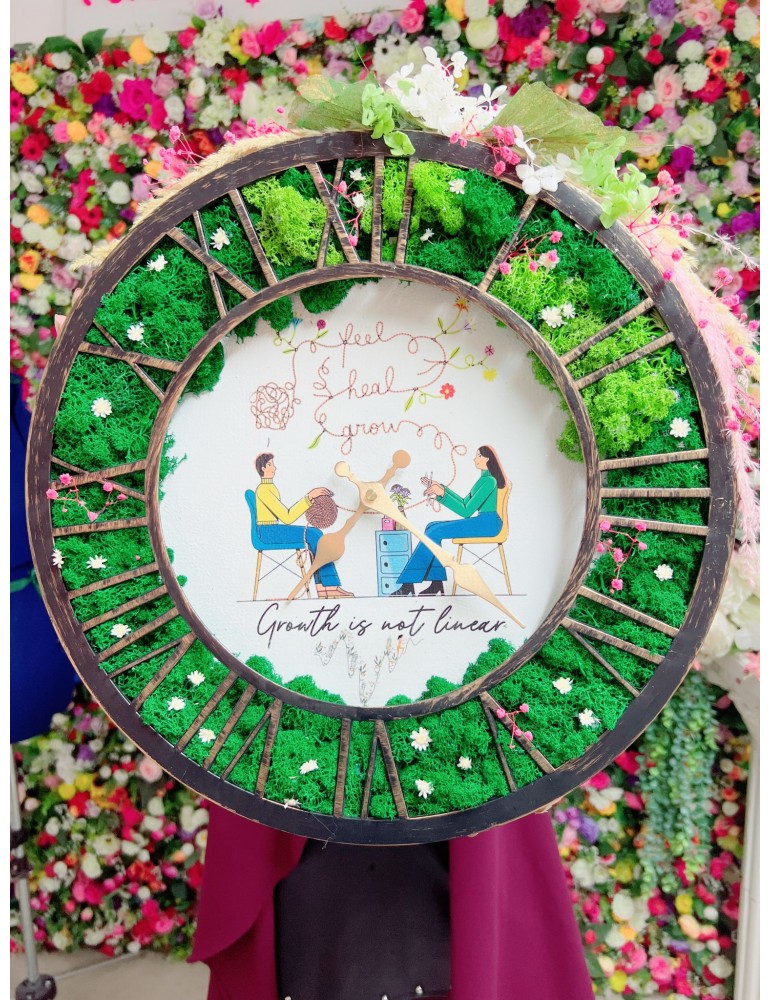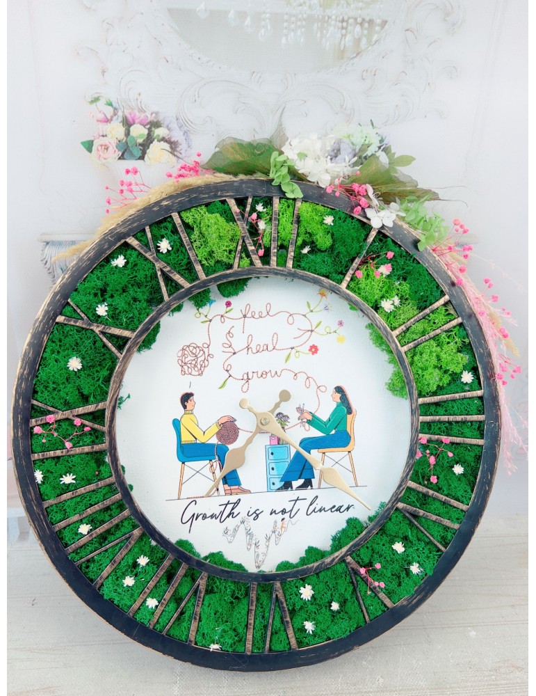 Descoperă un ceas de perete handmade, creat prin tehnica decoupage, împodobit cu licheni naturali și flori uscate, simbol al echilibrului și armoniei. Un cadou deosebit pentru psihologi, terapeuți sau coachi, menit să exprime recunoștința și aprecierea față de ghizii sufletului și ai minții. Inscripționat cu mesajul inspirațional "Feel, Heal, Grow", acest ceas este mai mult decât un obiect decorativ – este un simbol al transformării și al vindecării interioare. Perfect pentru a adăuga o notă de natură și serenitate în orice cabinet de terapie sau spațiu de lucru.