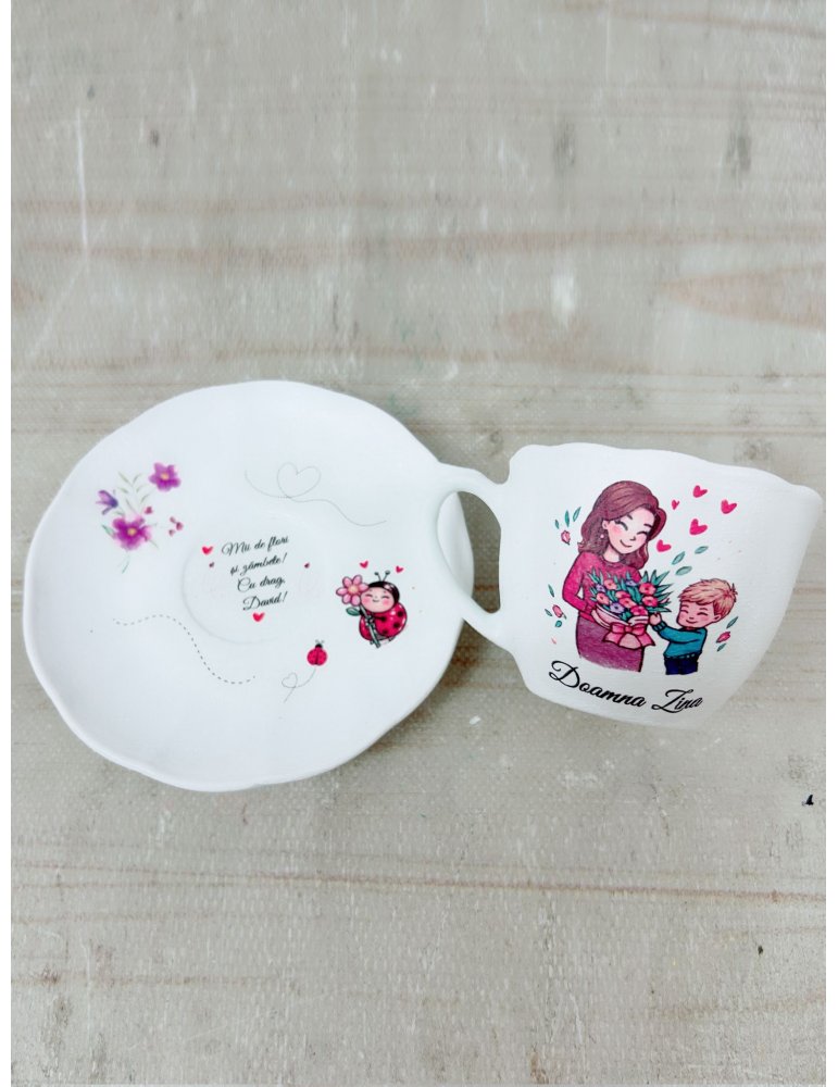 Cană este personalizată cu o ilustrație emoționantă și numele educatoarei sau învățătoarei, iar farfuria asortată completează armonios setul printr-un mesaj dedicat și elemente florale fine. Împreună, acestea formează un cadou elegant, util și memorabil, ideal pentru a exprima recunoștința față de dascăli.