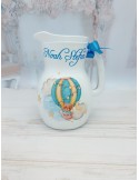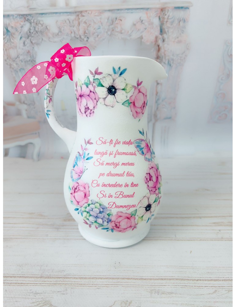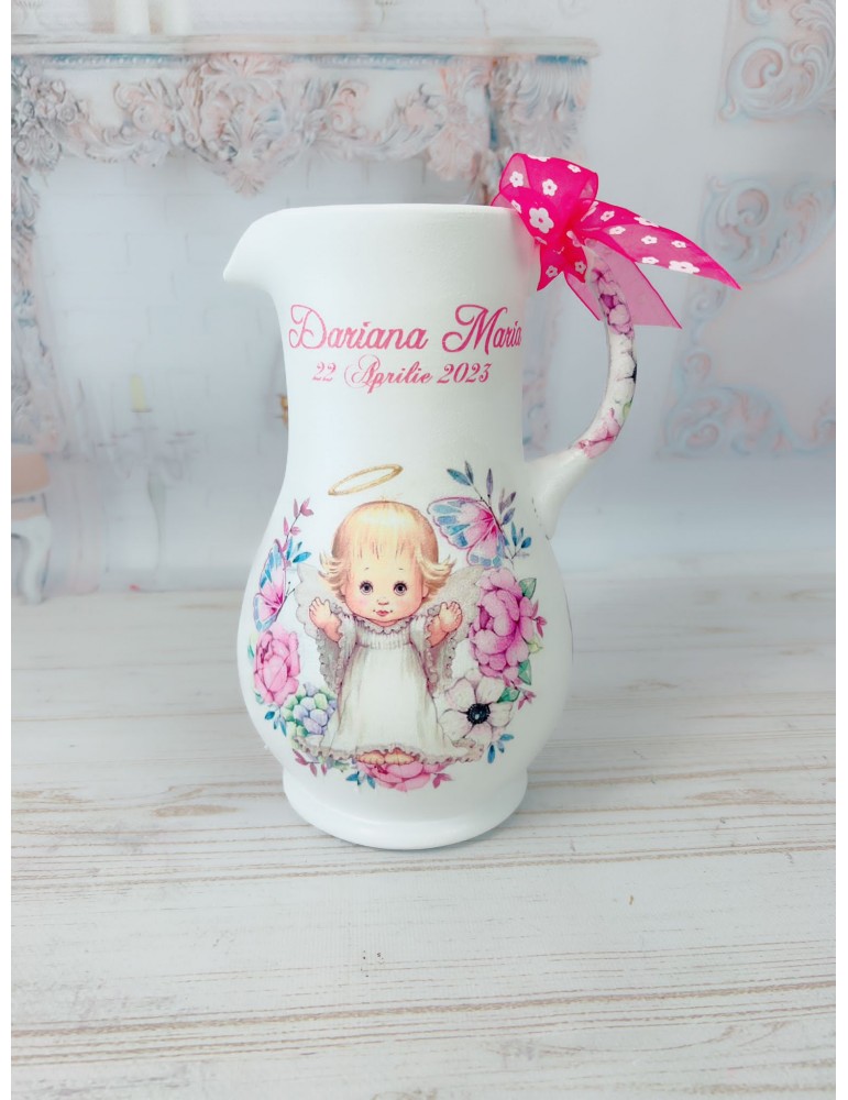 Această cantă de botez personalizată este un accesoriu decorativ elegant și unic, creat cu grijă în atelierul nostru. Fiecare piesă este vopsită și lăcuită manual, oferind un finisaj impecabil și durabil. Personalizarea carafei de botez pentru copil se realizează în funcție de preferințele tale: poți alege orice grafică dorită, numele și data evenimentului, iar pentru un plus de emoție, putem include și fotografia copilului.