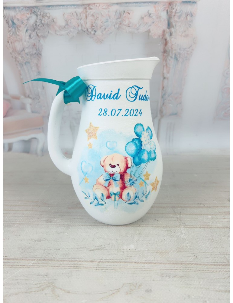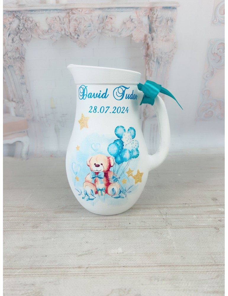 Această cantă de botez personalizată este un accesoriu decorativ elegant și unic, creat cu grijă în atelierul nostru. Fiecare piesă este vopsită și lăcuită manual, oferind un finisaj impecabil și durabil. Personalizarea carafei de botez pentru copil se realizează în funcție de preferințele tale: poți alege orice grafică dorită, numele și data evenimentului, iar pentru un plus de emoție, putem include și fotografia copilului.