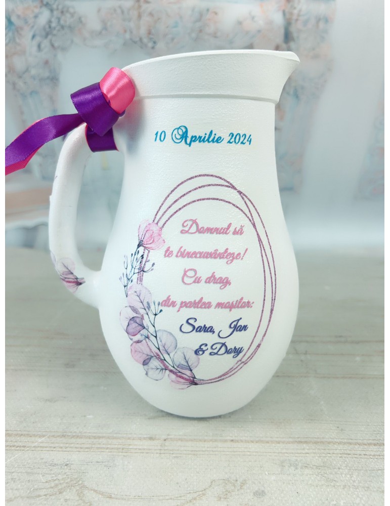 Alege această cantă personalizată pentru a adăuga o notă elegantă și distinctivă evenimentului de botez sau pentru a oferi un cadou memorabil.