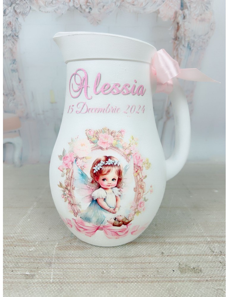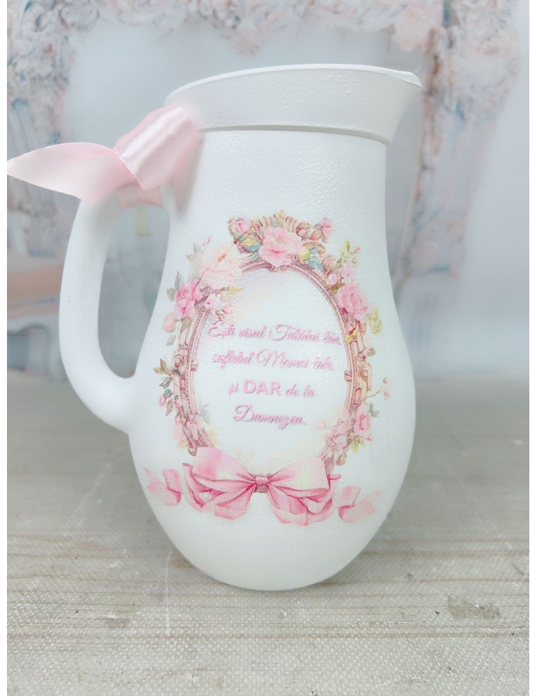 Această cantă de botez personalizată este un accesoriu decorativ elegant și unic, creat cu grijă în atelierul nostru. Fiecare piesă este vopsită și lăcuită manual, oferind un finisaj impecabil și durabil. Personalizarea carafei de botez pentru copil se realizează în funcție de preferințele tale: poți alege orice grafică dorită, numele și data evenimentului, iar pentru un plus de emoție, putem include și fotografia copilului.