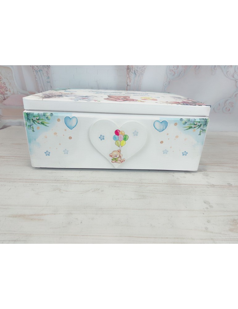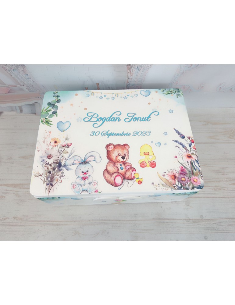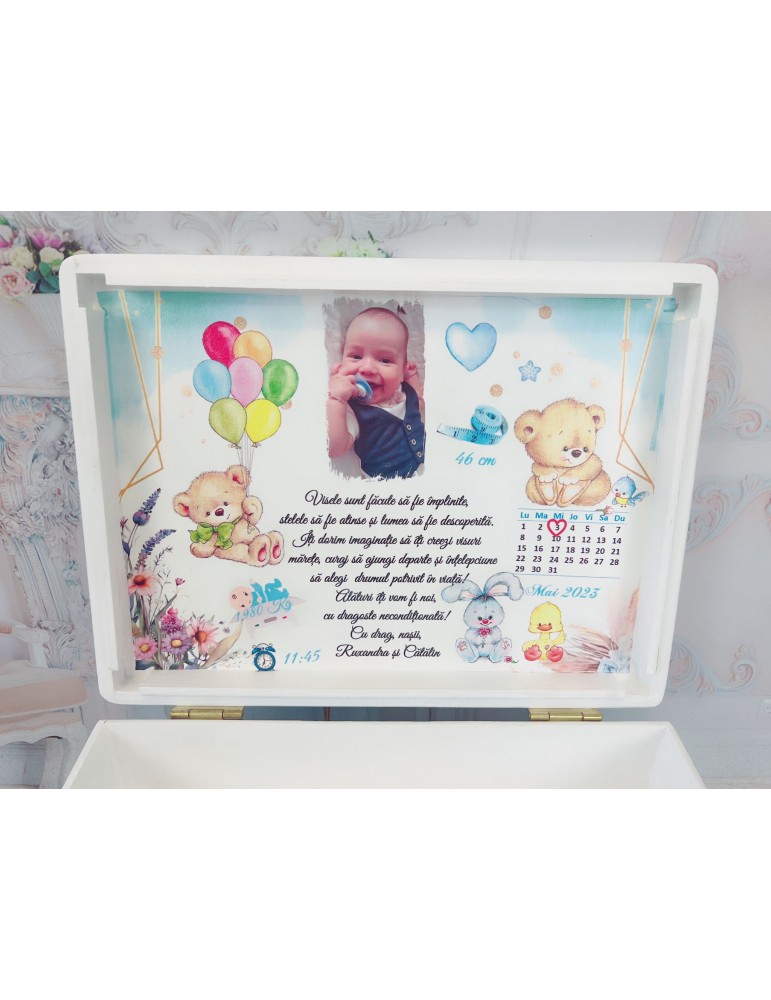 Descoperă o cutie de amintiri unică, realizată cu grijă în atelierul nostru, perfectă pentru a păstra cele mai prețioase momente din viața copilului tău! Această cutie este confecționată din lemn de calitate, vopsită și lăcuită manual, fiecare detaliu fiind realizat cu atenție și pasiune. Grafica delicată, este adaptată special și transferată prin tehnica decoupage, asigurând un design fermecător și durabil.