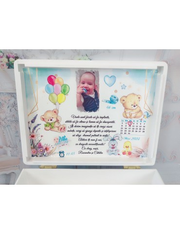 Pretul afisat se refera la o singura cutie de amintiri din lemn (fara alte accesorii) si include personalizarea acesteia cu datele copilului de la nastere. - Dimensiuni cutie de amintiri