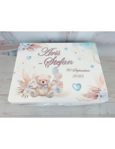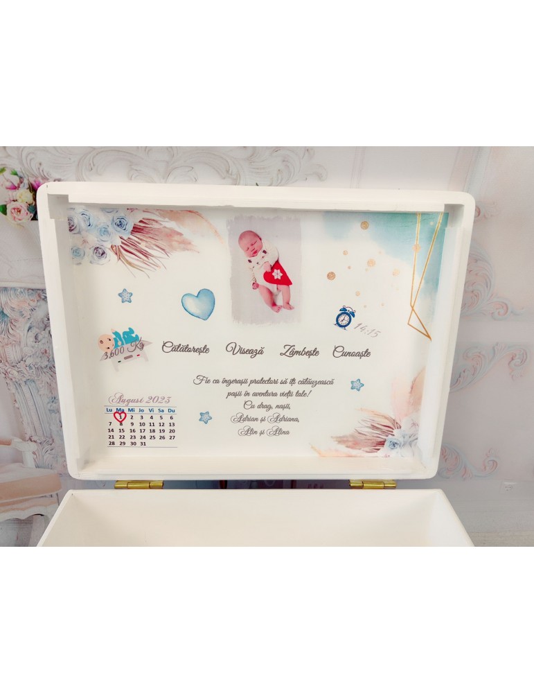 Pretul afisat se refera la o singura cutie de amintiri din lemn (fara alte accesorii) si include personalizarea acesteia cu datele copilului de la nastere. - Dimensiuni cutie de amintiri