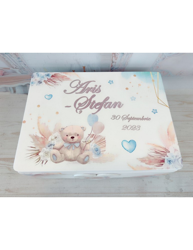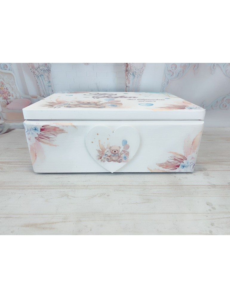 Descoperă o cutie de amintiri unică, realizată cu grijă în atelierul nostru, perfectă pentru a păstra cele mai prețioase momente din viața copilului tău! Această cutie este confecționată din lemn de calitate, vopsită și lăcuită manual, fiecare detaliu fiind realizat cu atenție și pasiune. Grafica delicată, este adaptată special și transferată prin tehnica decoupage, asigurând un design fermecător și durabil.
