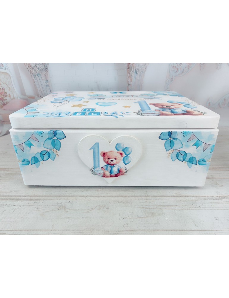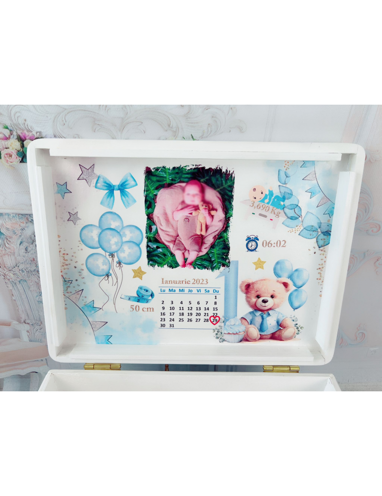 Descoperă o cutie de amintiri unică, realizată cu grijă în atelierul nostru, perfectă pentru a păstra cele mai prețioase momente din viața copilului tău! Această cutie este confecționată din lemn de calitate, vopsită și lăcuită manual, fiecare detaliu fiind realizat cu atenție și pasiune. Grafica delicată, este adaptată special și transferată prin tehnica decoupage, asigurând un design fermecător și durabil.