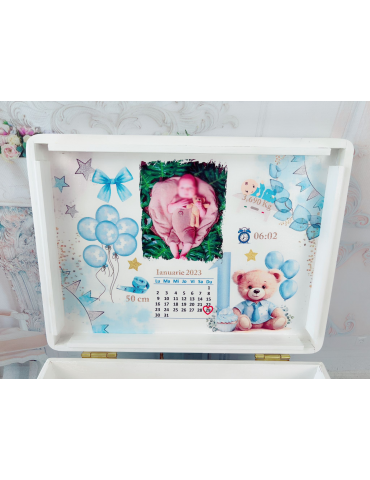 Pretul afisat se refera la o singura cutie de amintiri din lemn (fara alte accesorii) si include personalizarea acesteia cu datele copilului de la nastere. - Dimensiuni cutie de amintiri