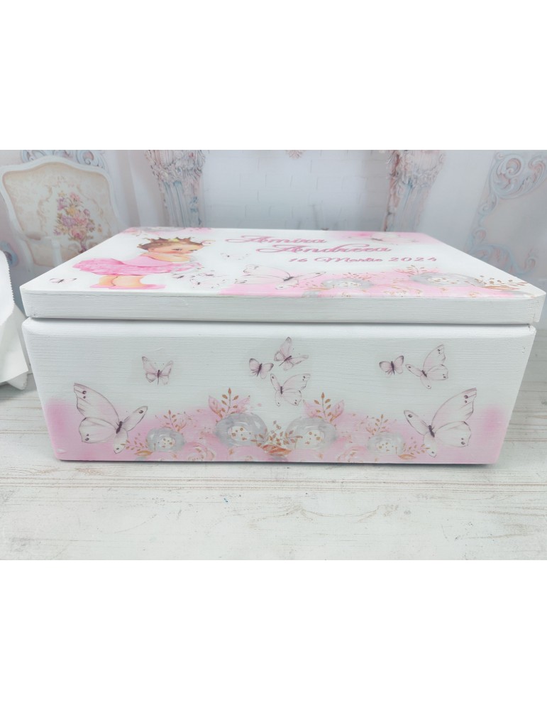 Descoperă o cutie de amintiri unică, realizată cu grijă în atelierul nostru, perfectă pentru a păstra cele mai prețioase momente din viața copilului tău! Această cutie este confecționată din lemn de calitate, vopsită și lăcuită manual, fiecare detaliu fiind realizat cu atenție și pasiune. Grafica delicată, este adaptată special și transferată prin tehnica decoupage, asigurând un design fermecător și durabil.