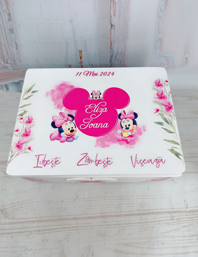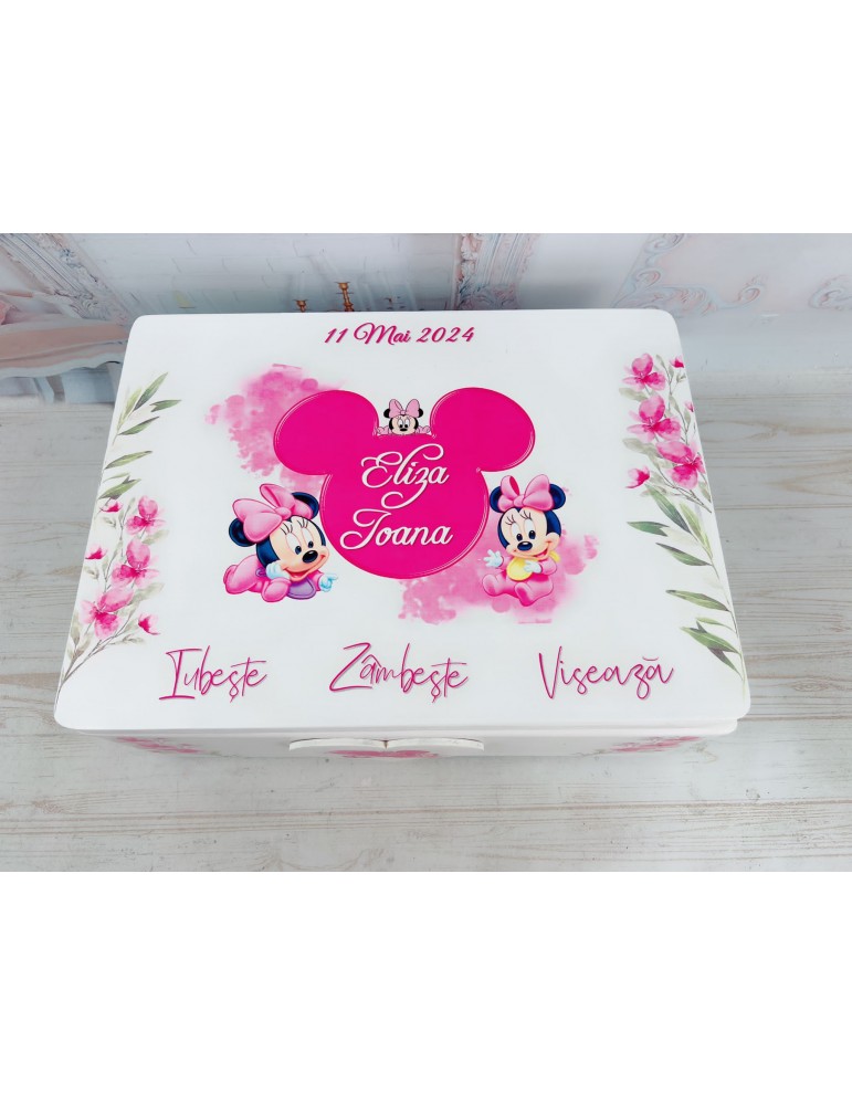 Cutie amintiri din lemn personalizata cu Minnie Mouse roz