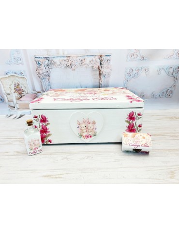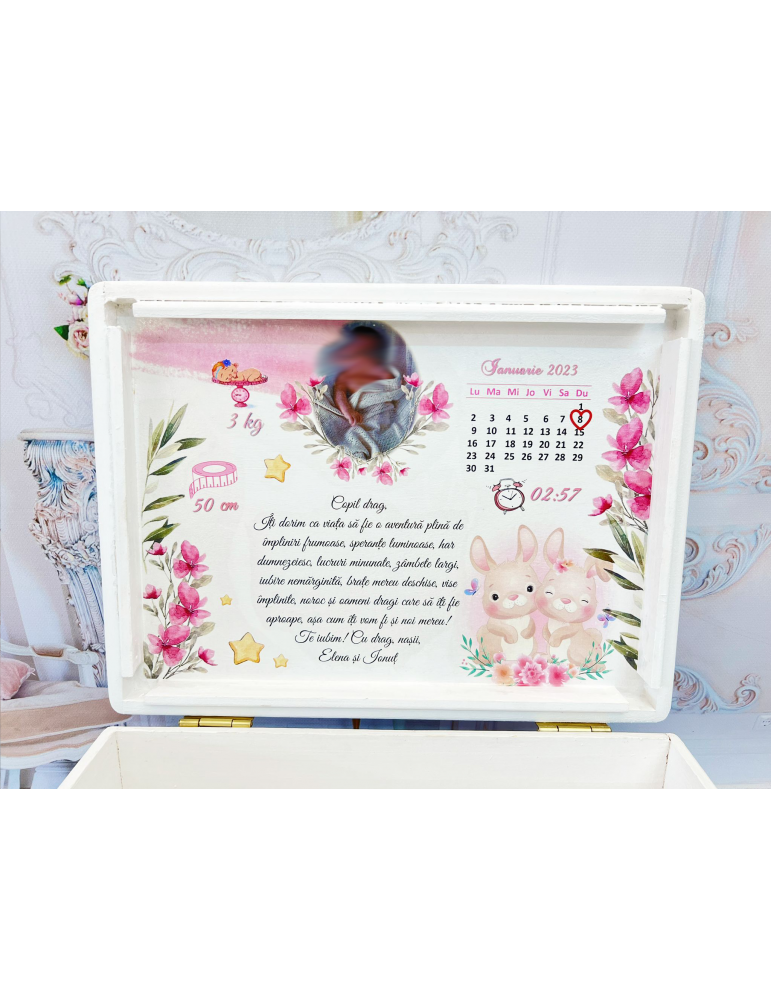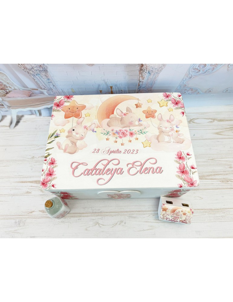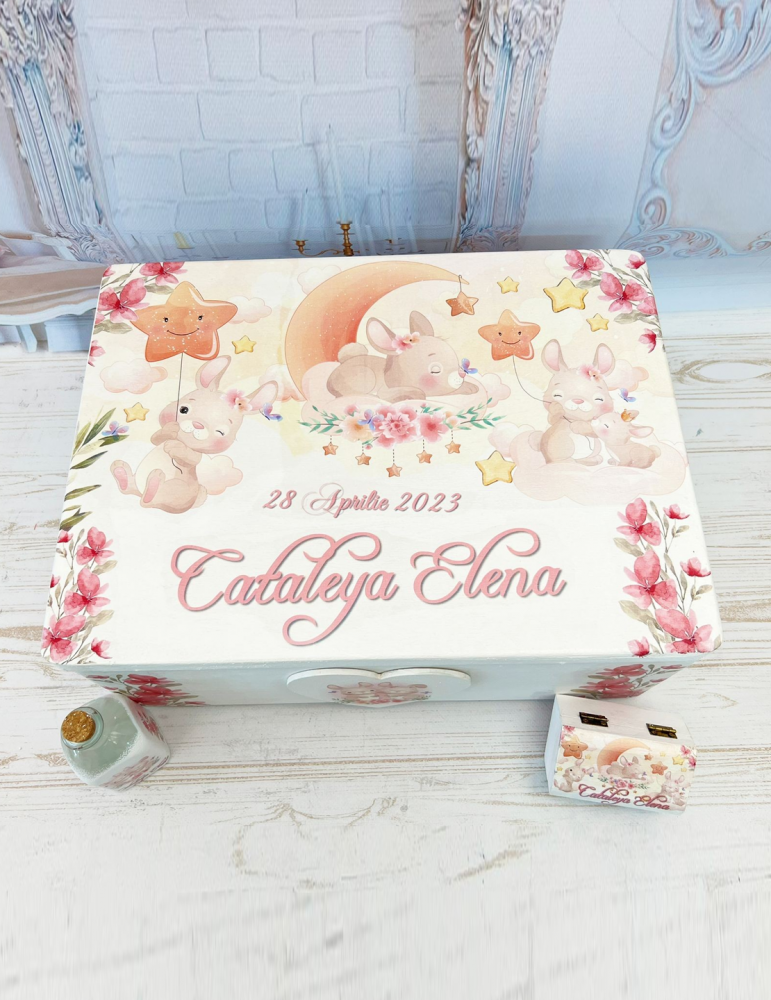 Cutie amintiri din lemn personalizata cu tematica iepuri