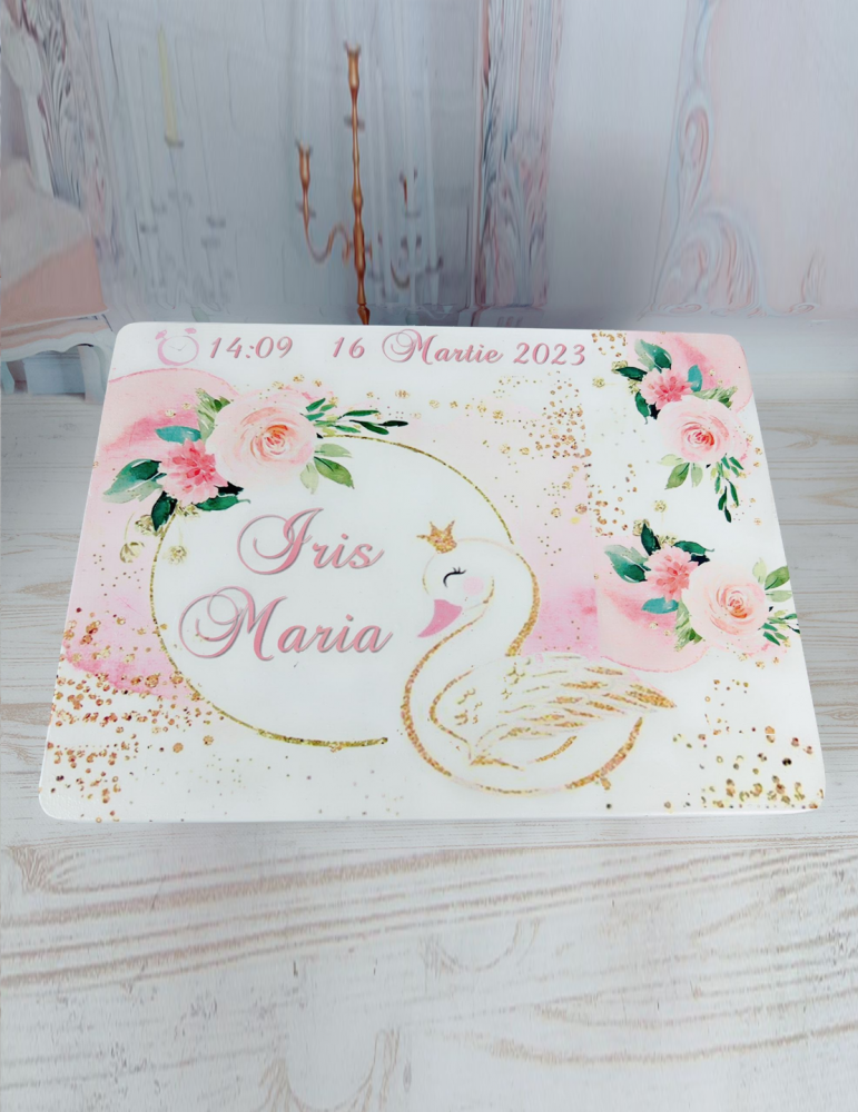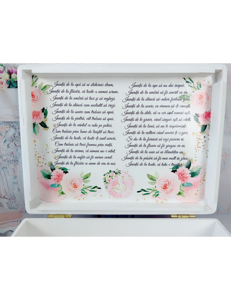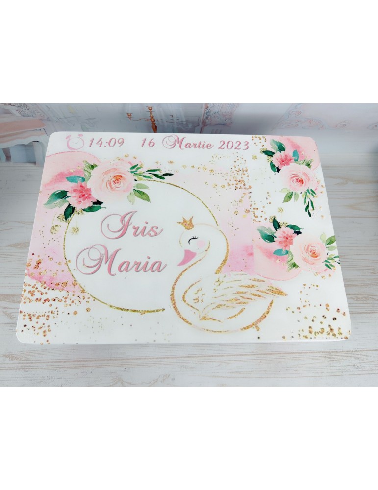 Cutie amintiri din lemn personalizata cu tematica lebada nuante roz