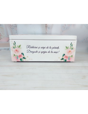Descoperă o cutie de amintiri unică, realizată cu grijă în atelierul nostru, perfectă pentru a păstra cele mai prețioase momente din viața copilului tău! Această cutie este confecționată din lemn de calitate, vopsită și lăcuită manual, fiecare detaliu fiind realizat cu atenție și pasiune. Grafica delicată, este adaptată special și transferată prin tehnica decoupage, asigurând un design fermecător și durabil.