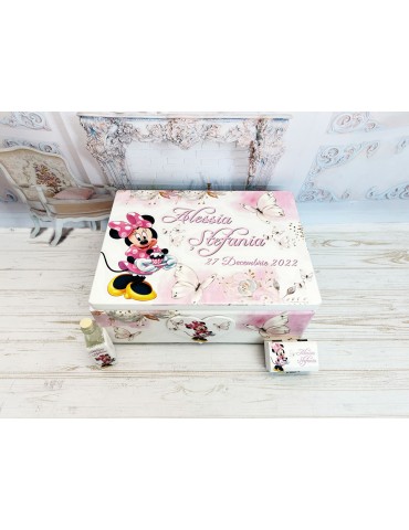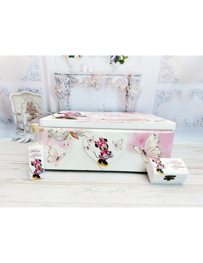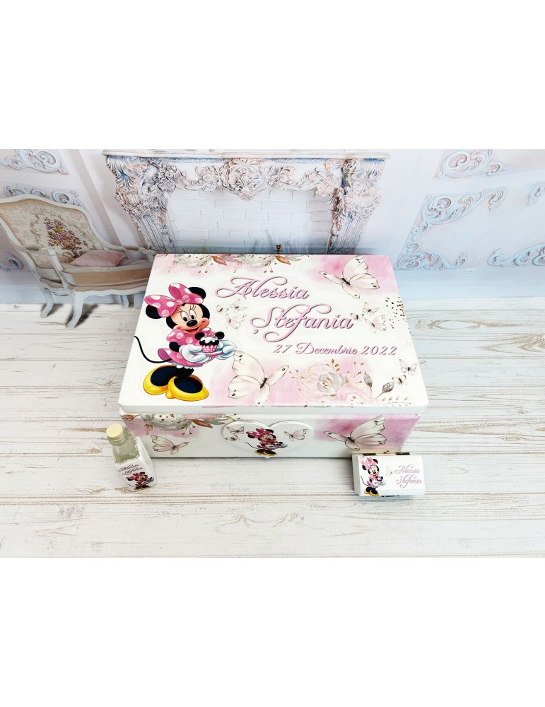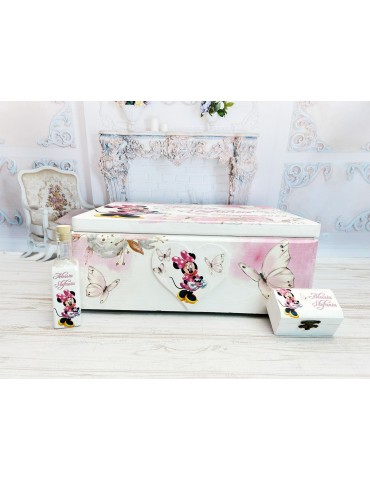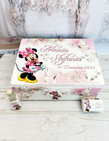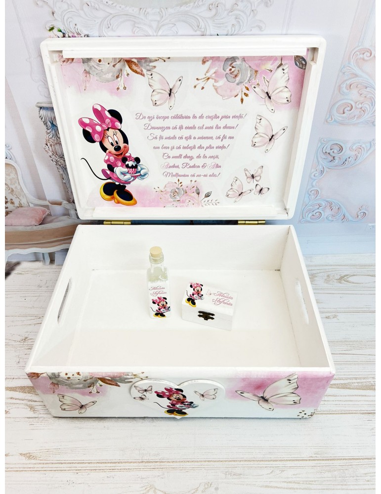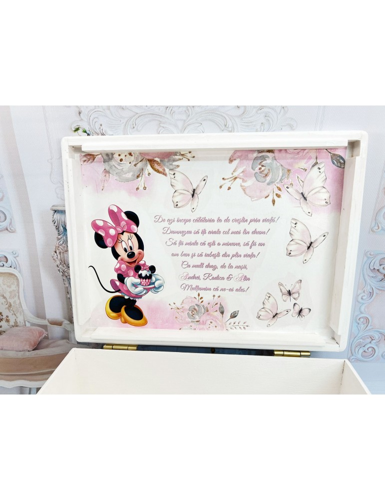 Cutie amintiri din lemn personalizata cu Minnie nuante roz pal