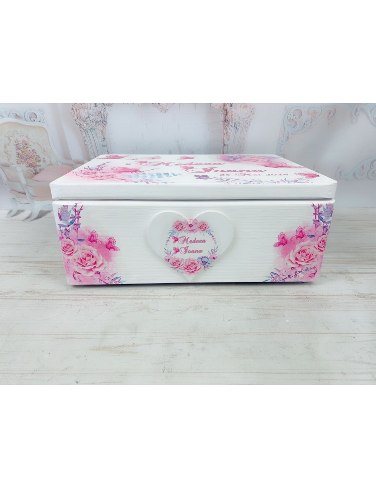 Descoperă o cutie de amintiri unică, realizată cu grijă în atelierul nostru, perfectă pentru a păstra cele mai prețioase momente din viața copilului tău! Această cutie este confecționată din lemn de calitate, vopsită și lăcuită manual, fiecare detaliu fiind realizat cu atenție și pasiune. Grafica delicată, este adaptată special și transferată prin tehnica decoupage, asigurând un design fermecător și durabil.