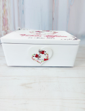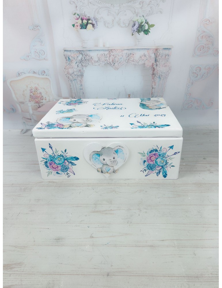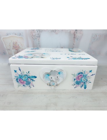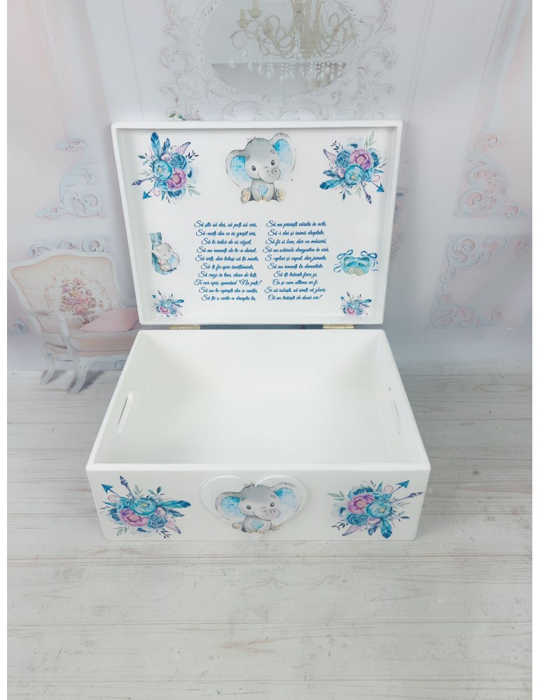 Descoperă o cutie de amintiri unică, realizată cu grijă în atelierul nostru, perfectă pentru a păstra cele mai prețioase momente din viața copilului tău! Această cutie este confecționată din lemn de calitate, vopsită și lăcuită manual, fiecare detaliu fiind realizat cu atenție și pasiune. Grafica delicată, este adaptată special și transferată prin tehnica decoupage, asigurând un design fermecător și durabil.