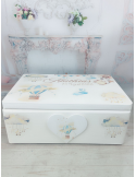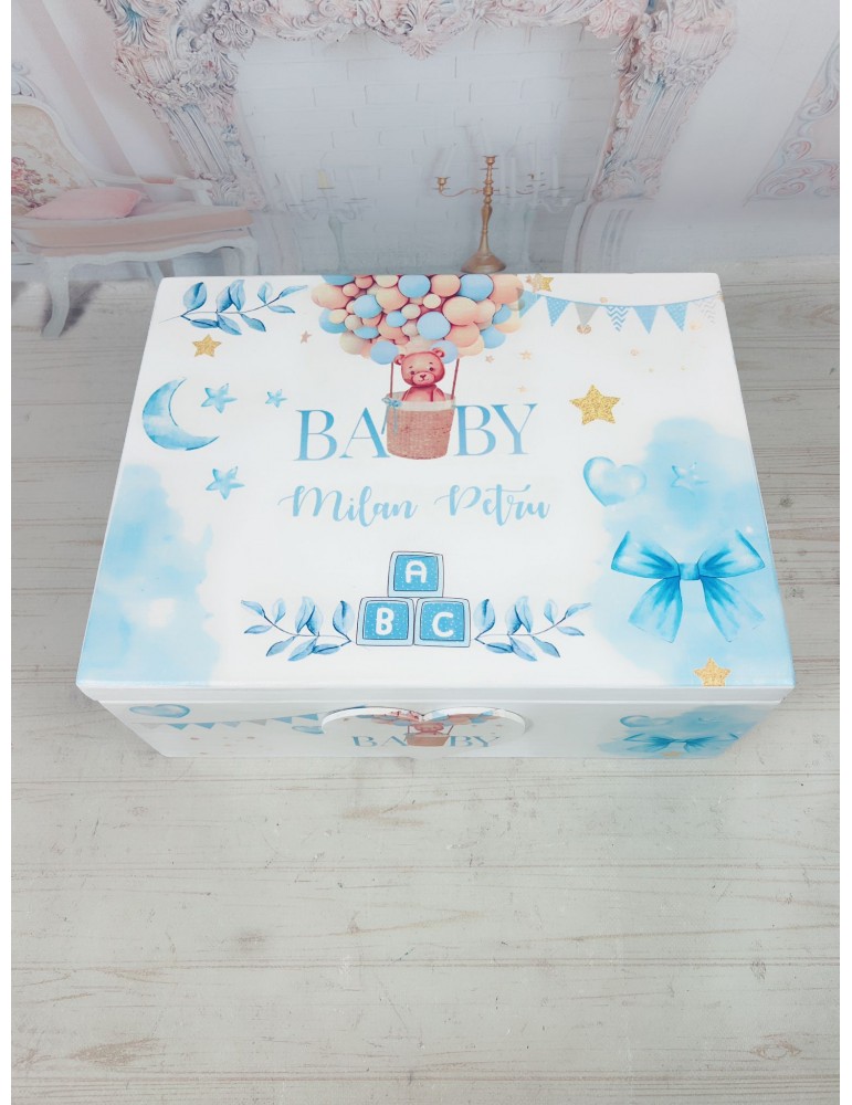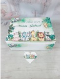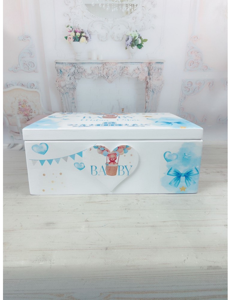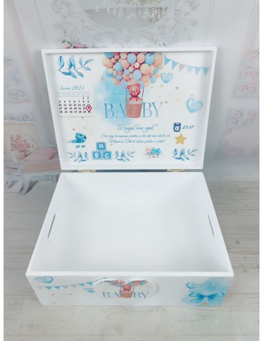 Descoperă o cutie de amintiri unică, realizată cu grijă în atelierul nostru, perfectă pentru a păstra cele mai prețioase momente din viața copilului tău! Această cutie este confecționată din lemn de calitate, vopsită și lăcuită manual, fiecare detaliu fiind realizat cu atenție și pasiune. Grafica delicată, este adaptată special și transferată prin tehnica decoupage, asigurând un design fermecător și durabil.