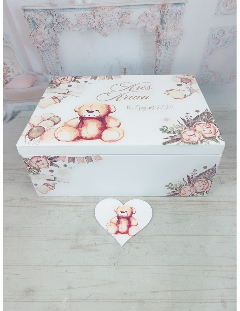 Descoperă o cutie de amintiri unică, realizată cu grijă în atelierul nostru, perfectă pentru a păstra cele mai prețioase momente din viața copilului tău! Această cutie este confecționată din lemn de calitate, vopsită și lăcuită manual, fiecare detaliu fiind realizat cu atenție și pasiune. Grafica delicată, este adaptată special și transferată prin tehnica decoupage, asigurând un design fermecător și durabil.